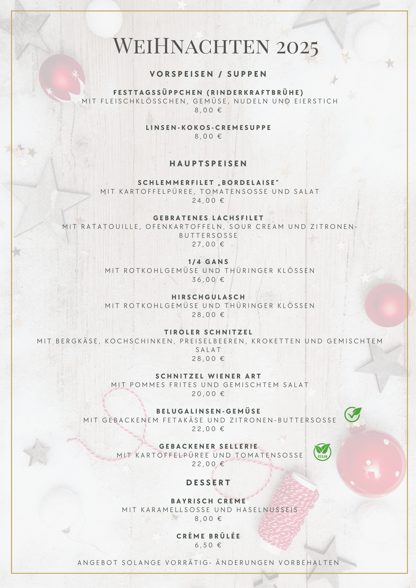 Die schönste Zeit des Jahres verdient eine unvergessliche Speisekarte. Entdecken Sie jetzt, was Sie bei uns zur Weihnachtszeit erwartet!